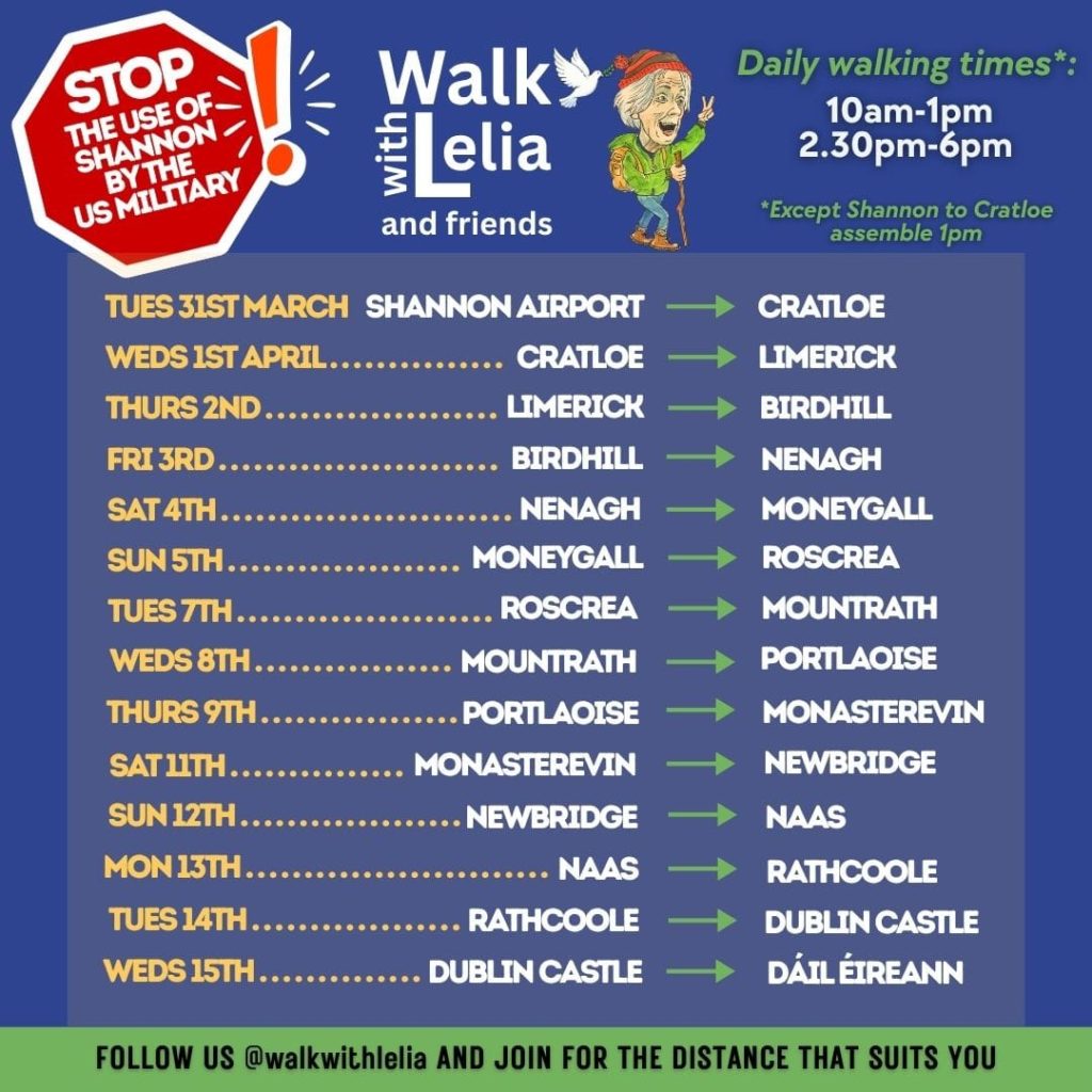 ‘Walk with Lelia’ and friends from Shannon airport to Dáil Éireann. Starts 1pm TUESDAY MARCH 31st 2026 from SHANNON AIRPORT, COUNTY CLARE. Lelia Doolan and Shannonwatch have organised a peace walk, to be accompanied at various points along the way by activists and members of the public. Walking from Shannon airport through Cratloe, Limerick, Birdhill, Nenagh, Moneygall, Roscrea, Mountrath, Portlaoise, Monasterevin, Newbridge, Naas, Rathcoole, Dublin Castle on to Dáil Éireann on WEDNESDAY APRIL 15th. *All in agreement with the sentiments of the peace walk are invited to join in. *REGISTER to participate in the walk: https://form.jotform.com/260693431913357 *Volunteers sought to drive support vehicles, provide accommodation for those walking, and provide links with local community/solidarity groups along the route. *CONTACT if you want to get involved and offer support: walkwithlelia@proton.me