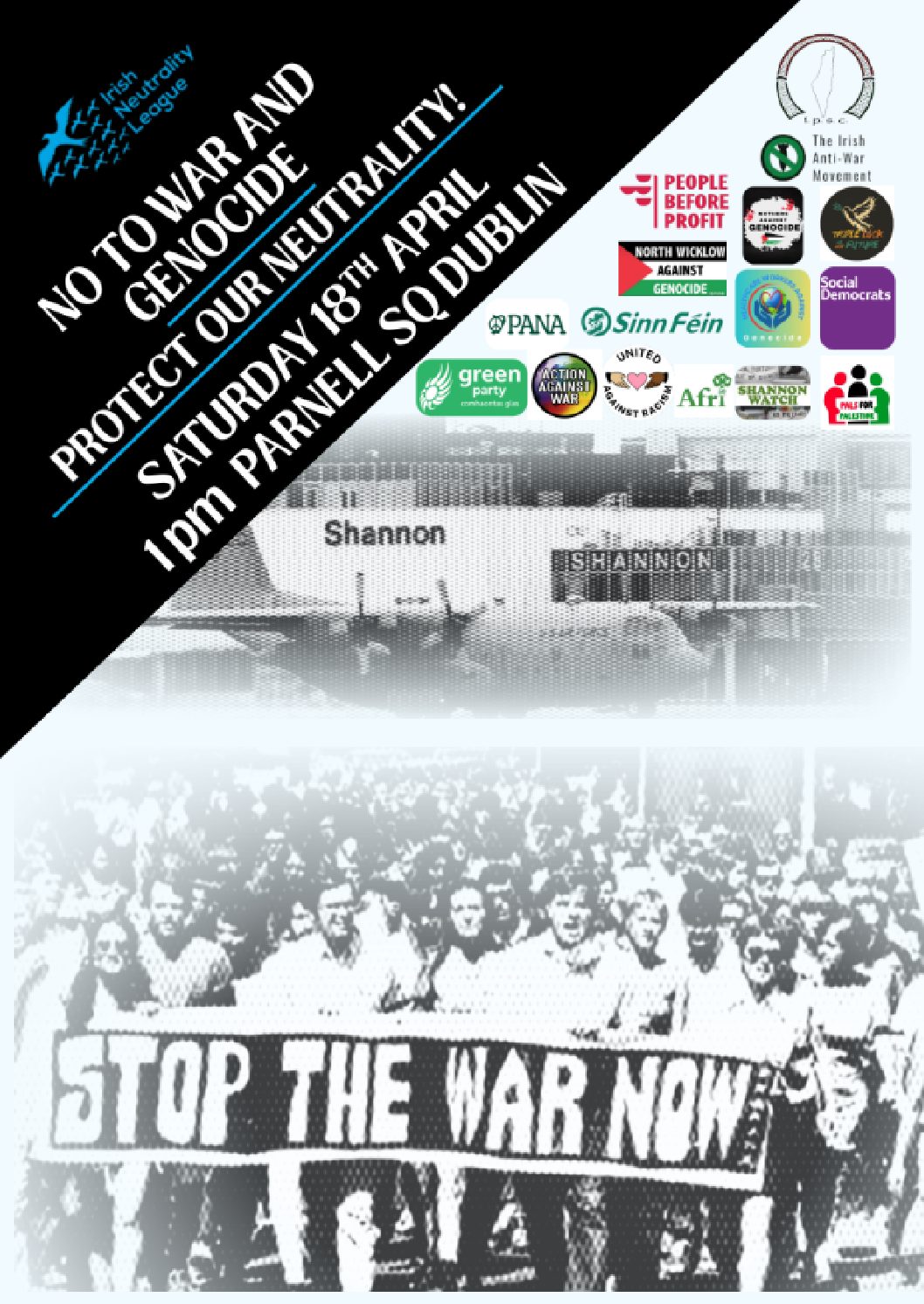 Backed by Action Against War, Afri, Greens, IAWM, IPSC, Mothers Against Genocide, North Wicklow Against Genocide, PANA, PBP, ShannonWatch, SF, Soc.Dems,Triple Lock Our Future, United Against Racism and more….